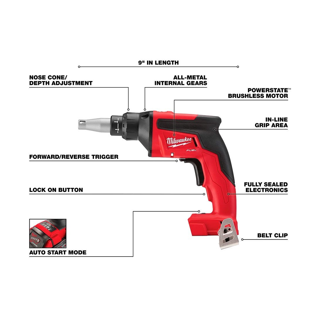 La pistola de tornillos para paneles de yeso M18 FUEL™ es MÁS RÁPIDA QUE LA OPCIÓN CON CABLE, incluye una funcionalidad de ARRANQUE AUTOMÁTICO y proporciona UN TIEMPO DE OPERACIÓN HASTA 3 VECES MAYOR que otros productos inalámbricos de la competencia. El motor sin escobillas(Carbones) POWERSTATE™ gira a 4,500 RPM, lo que proporciona una mayor productividad. Con la inteligencia REDLINK PLUS™, la función de ARRANQUE AUTOMÁTICO de Milwaukee arranca automáticamente el motor o hace contacto con el panel de yeso, lo que produce menos ruido entre los tornillos y un tiempo de operación hasta 3 veces más prolongado. La pistola de tornillos para paneles de yeso M18 FUEL proporciona el equilibrio y el peso deseados por los profesionales para utilizarla durante todo el día.