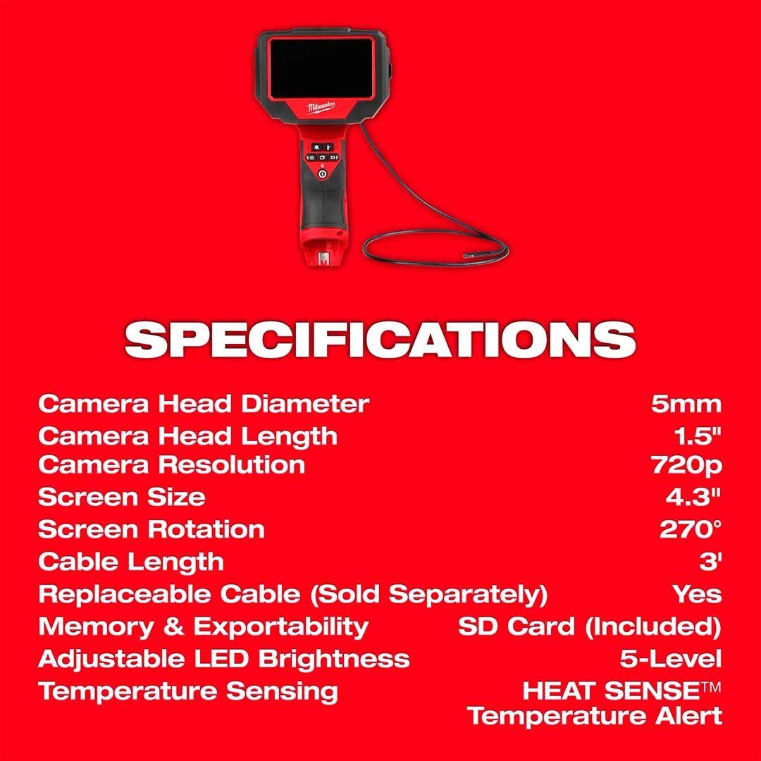 Ofrece acceso de 5 mm y un diagnóstico claro, satisfaciendo las necesidades de inspección en vehículos de pasajeros, camionetas ligeras y diésel. Alimentado por el sistema de batería M12™, este boroscopio es totalmente compatible con todas las soluciones M12™ de su caja de herramientas. El cabezal de cámara de 5 mm, junto con un cable de 90 cm optimizado para mayor rigidez, permite un acceso óptimo en espacios reducidos, incluyendo orificios de bujías incandescentes y puertos de inyectores de combustible. Las cámaras frontal y lateral con brillo LED ajustable ofrecen una mejor visibilidad de la aplicación. La captura de fotos y videos de alta definición con zoom 4x permite al técnico diagnosticar grietas finas con confianza. La pantalla giratoria de 4.3″ permite al técnico adaptar el boroscopio a su entorno de inspección. Acceda, exporte y comparta fácilmente los archivos almacenados en la tarjeta SD de 32 GB incluida. Equipado con la tecnología de alerta de temperatura HEAT SENSE™, si el vehículo inspeccionado está demasiado caliente para usar la cámara sin riesgo de daños, el boroscopio notifica al usuario y se apaga, lo que ayuda al técnico a prolongar la vida útil del cable. Cable de cámara reemplazable en campo (48-53-3150) para reducir el tiempo de inactividad.