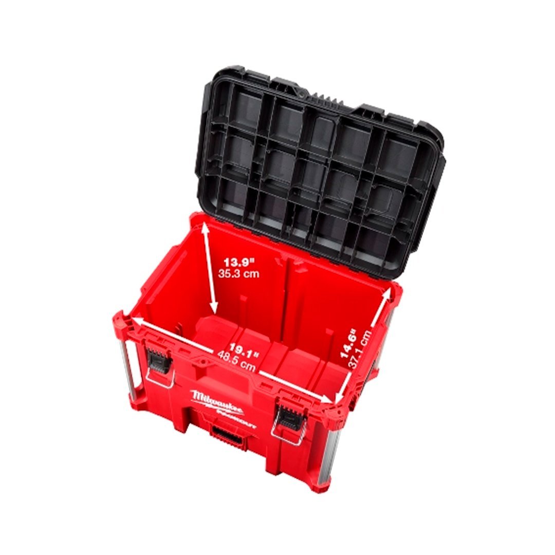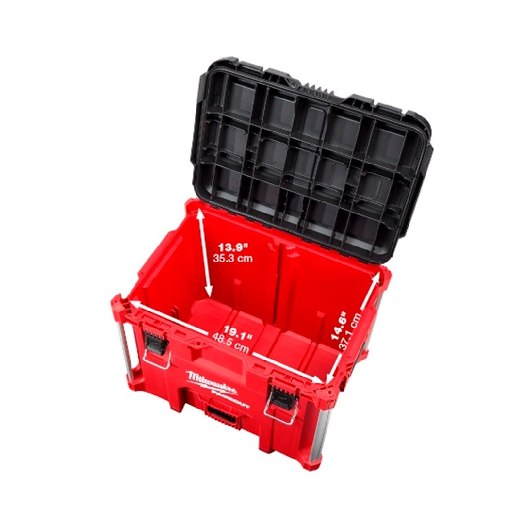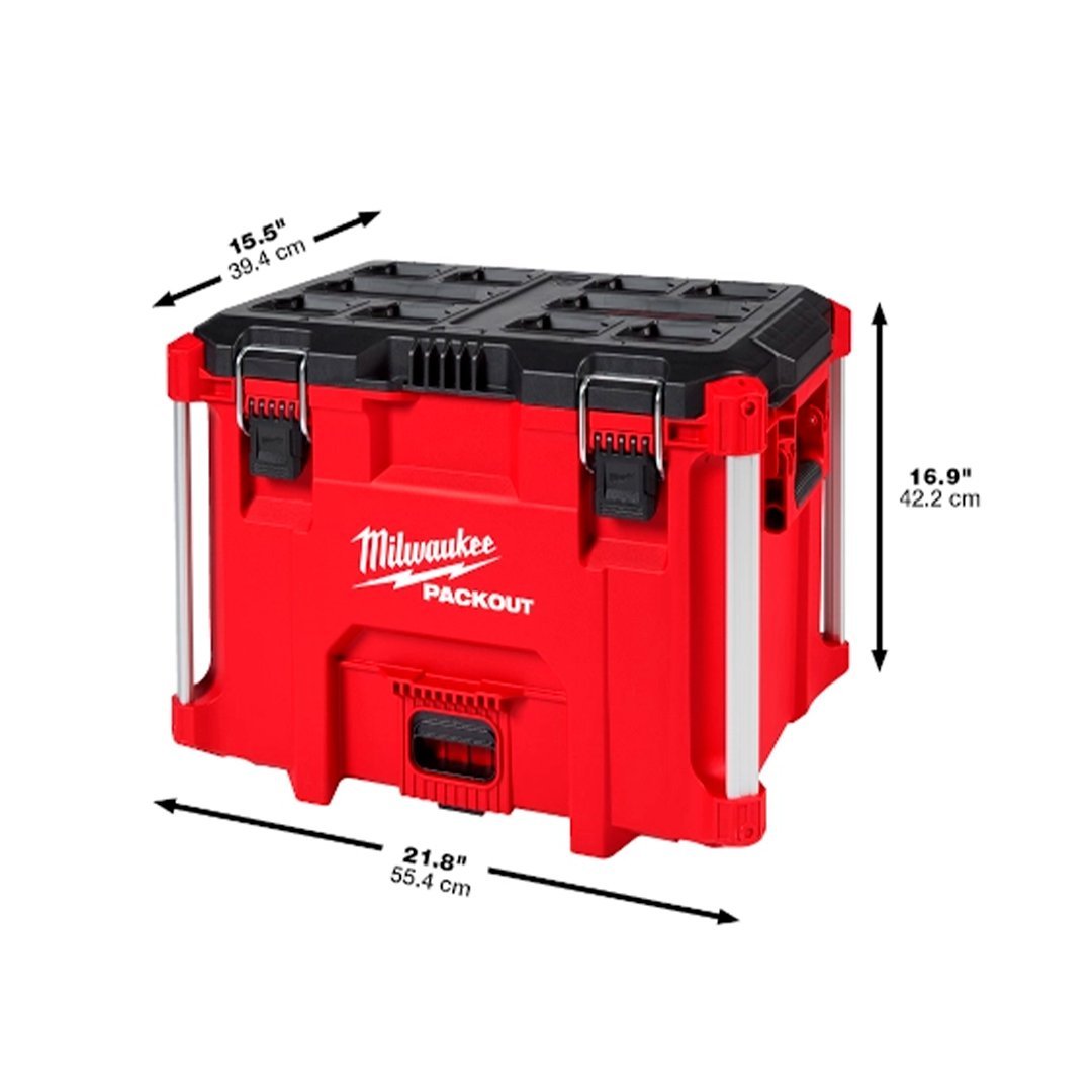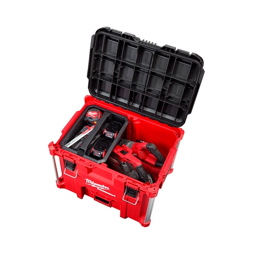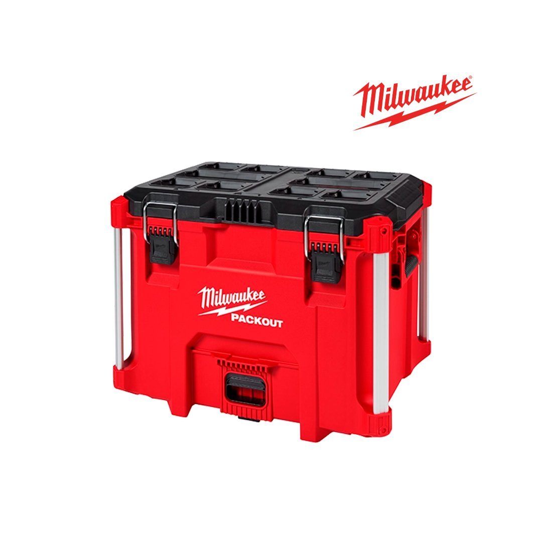 Nuestra caja de herramientas PACKOUT™ XL está fabricada con polímeros resistentes a impactos y esquinas reforzadas con metal para soportar las duras condiciones de trabajo.