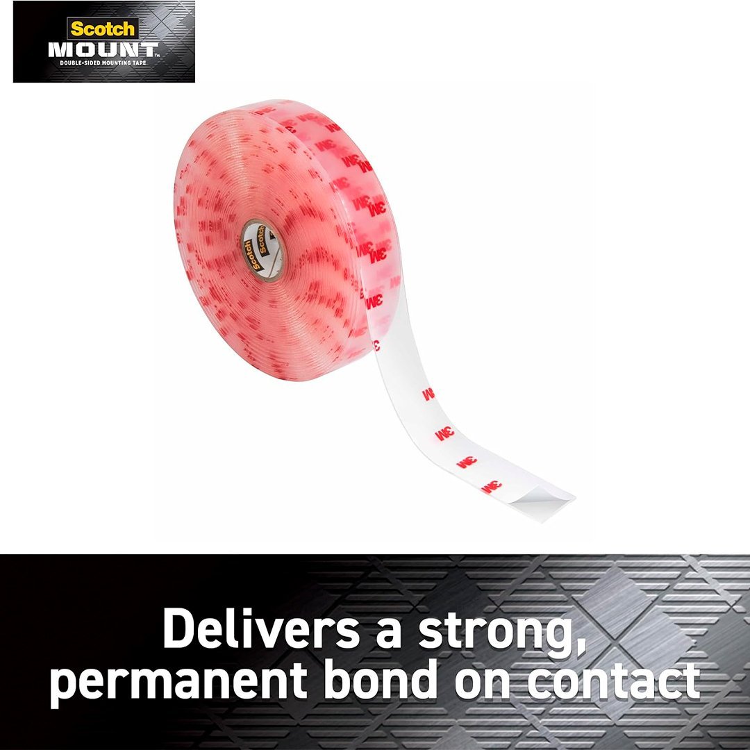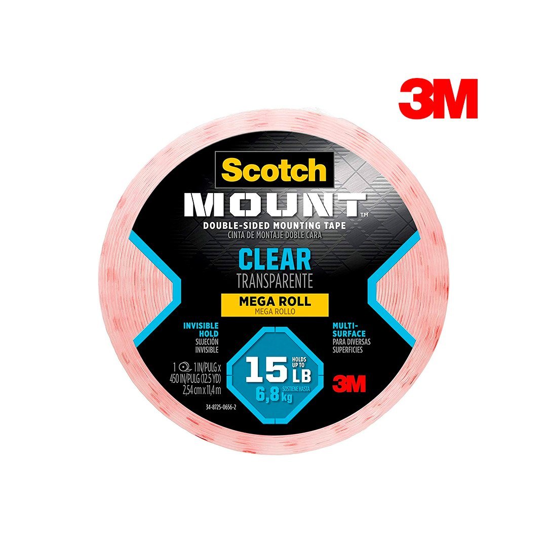 La Cinta de Montaje Doble Cara Scotch-Mount™ Transparente, cuenta con adhesivo de resistencia industrial 3M™. Con una capacidad de hasta 6.8 kg, esta cinta invisible se puede usar en interiores y es ideal sobre vidrio, metal, baldosas de cerámica y acrílico cuando desea resaltar lo que está colgando y no cómo está colgado.
