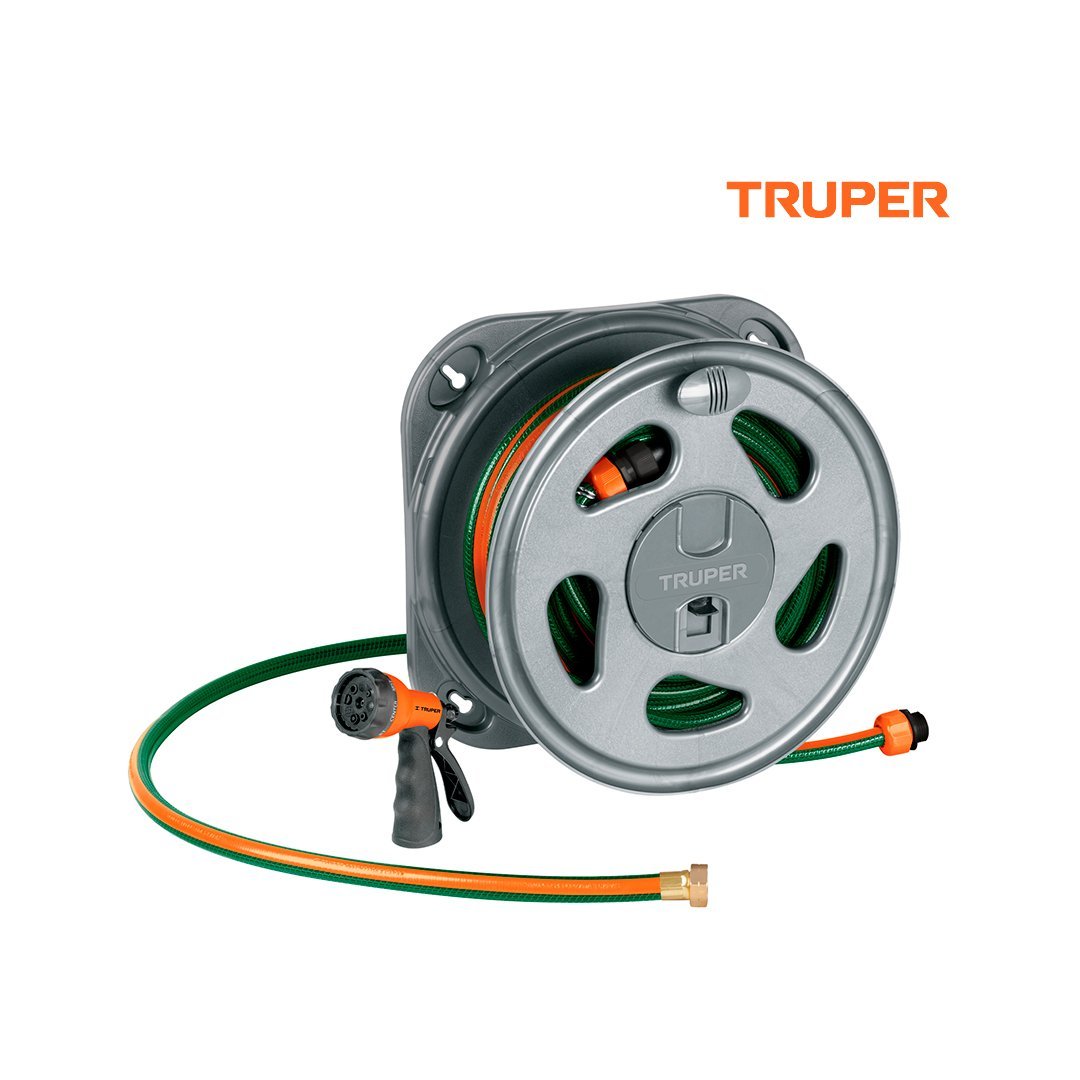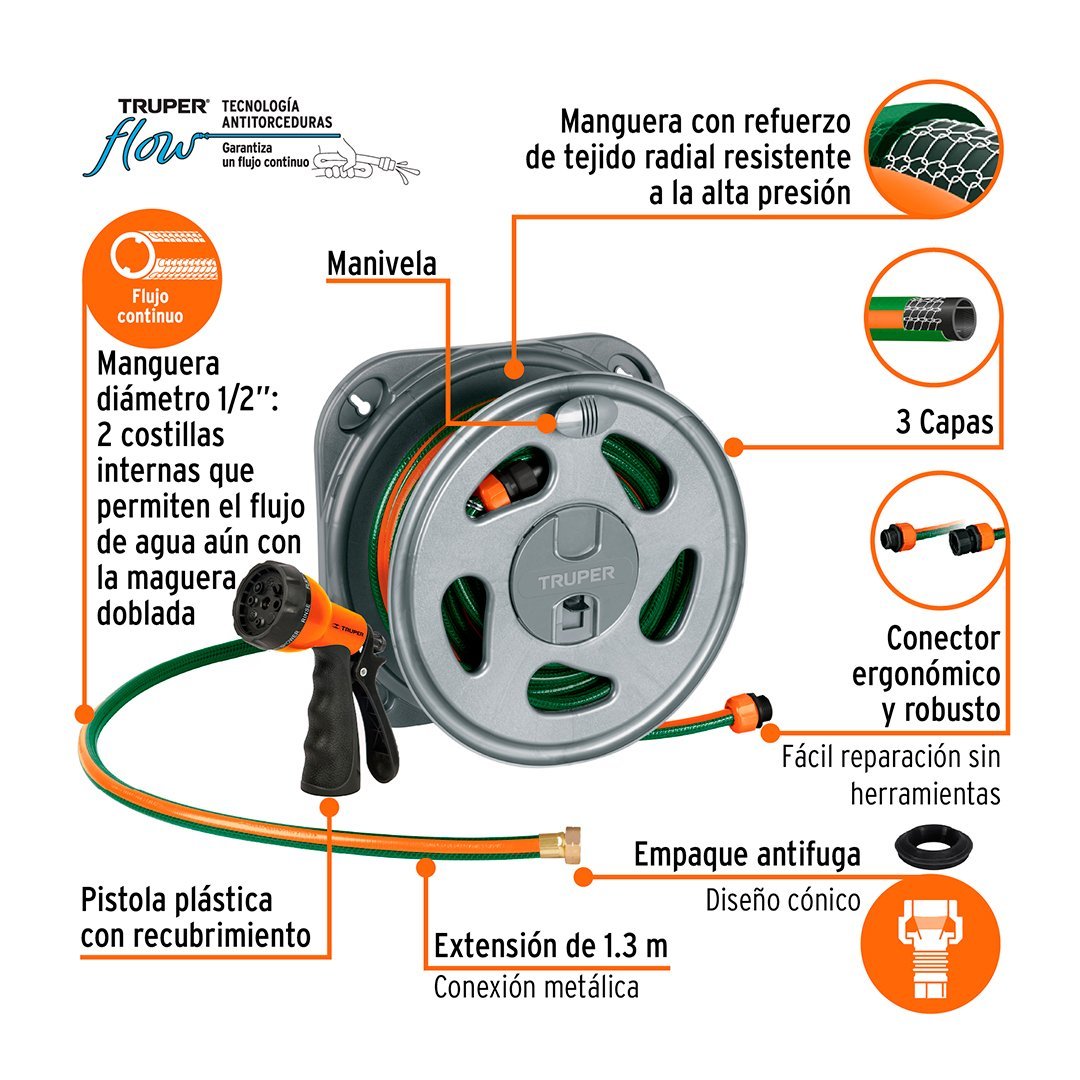 Combo de manguera reforzada 3 capas 1/2", pistola de riego plástica y porta manguera TRUPER cantidad