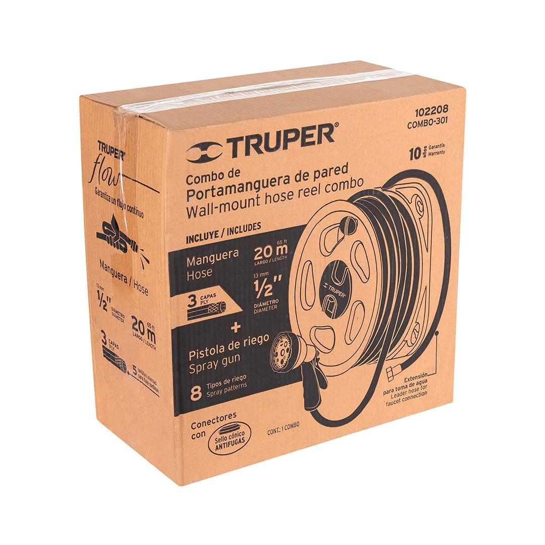 Combo de manguera reforzada 3 capas 1/2″, pistola de riego plástica y porta manguera TRUPER