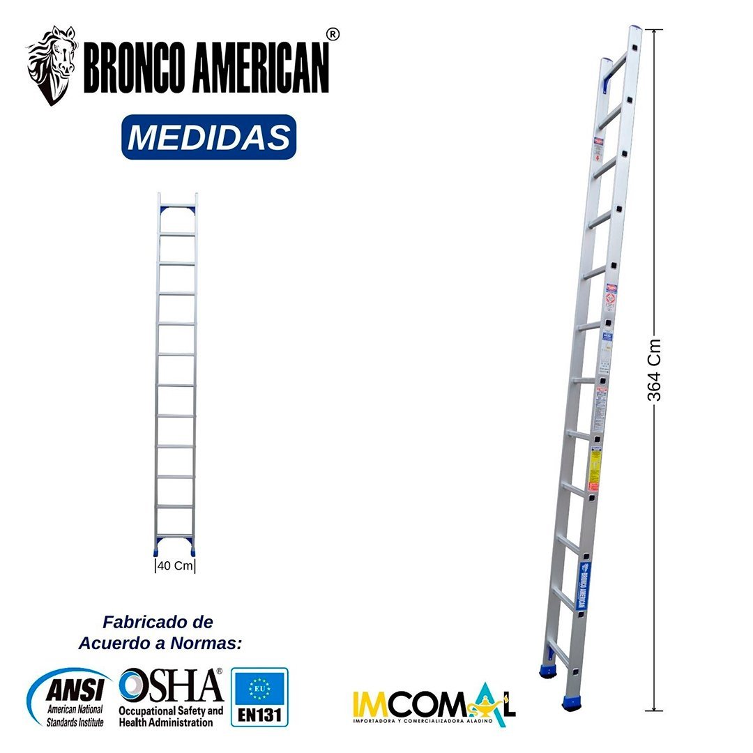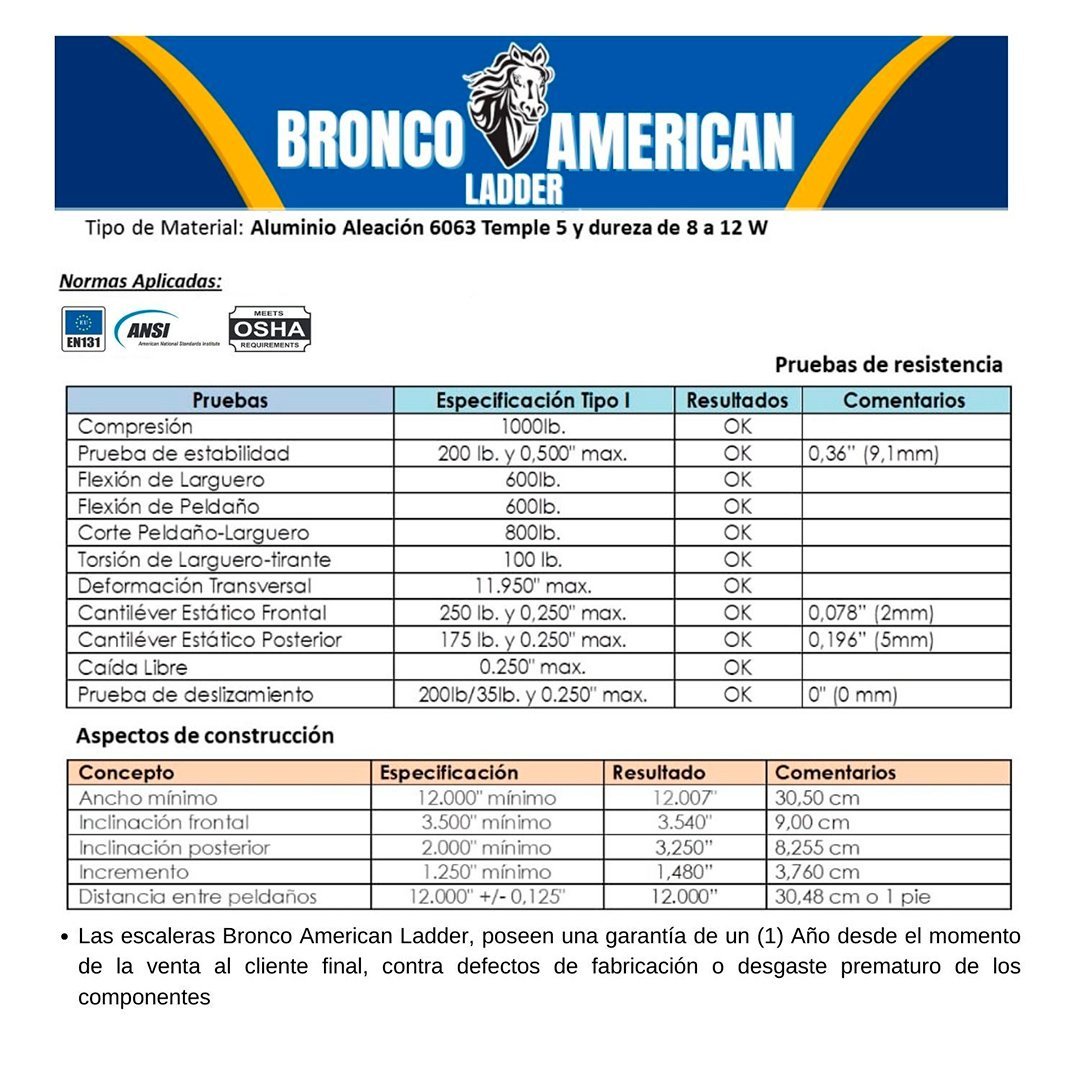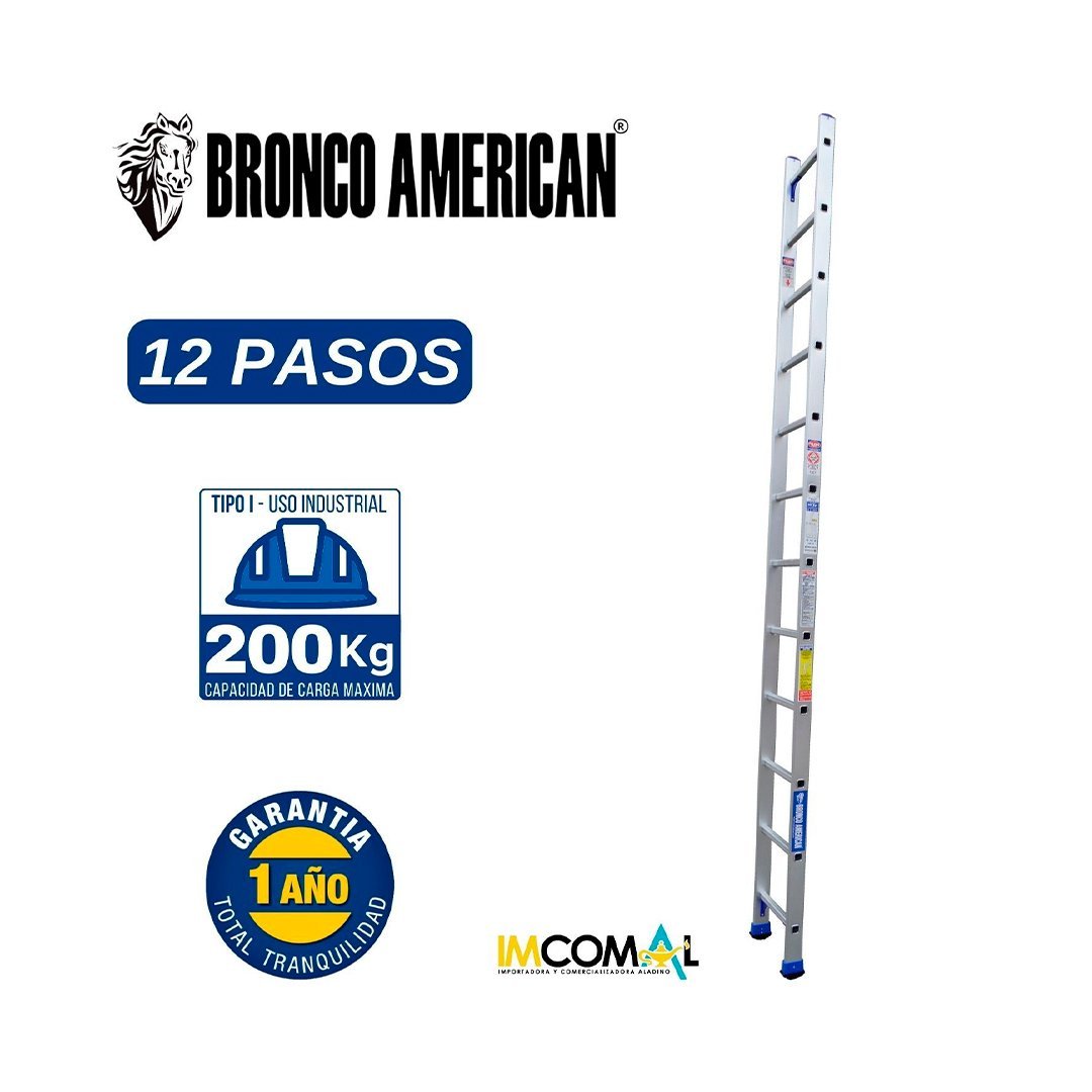 Marca: Bronco América Ladder|Tipo de Escalera: Arrimo o Simple de Apoyo|Modeló ALB-ES12|Número de Peldaños: 12|Material: Aluminio|Color: Aluminio|Altura máxima de Trabajo: 5,06 mts|Peso máximo soportado 175 kg|Uso de herramienta Profesional|Peldaños en Aluminio Templado en D y Relieve Antiresbalantes|Zapatas de Aluminio Ajustables con Jebe Antiresbalante|Garantía de 12 meses. (Por Defecto de Fábrica)