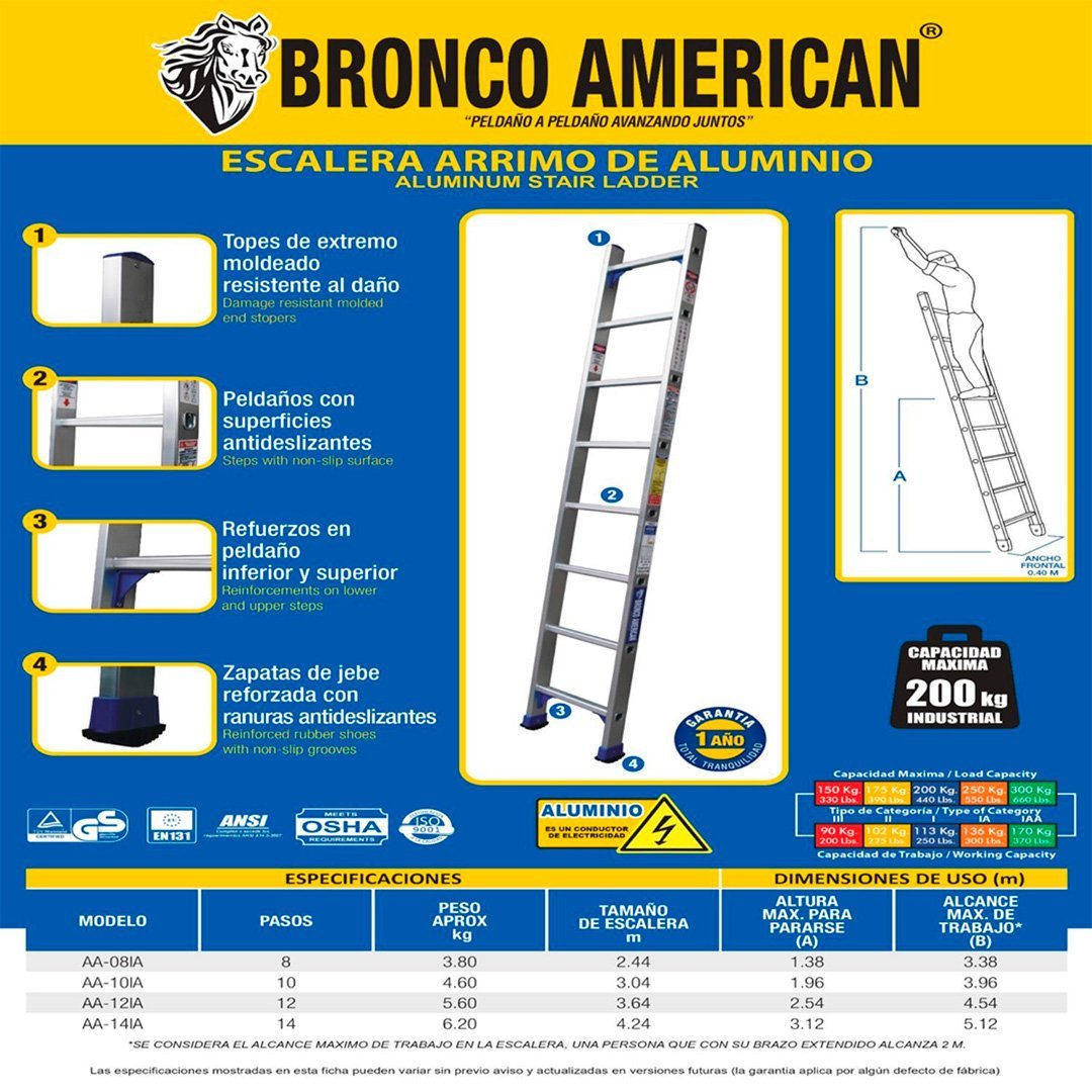 Escalera Aluminio Tipo Arrimo o Simple de Apoyo, ligera y resistente, tipo I, Marca Bronco American, construida en Aluminio y peldaños en forma D, con superficie antideslizante, patas con antideslizantes que garantizará firmeza, altura máxima de trabajo 5,06 mts. El límite de peso de carga máxima de los peldaños es de 200 Kg. ESPECIFICACIONES • Marca: Bronco América Ladder • Tipo de Escalera: Arrimo o Simple de Apoyo • Modeló ALB-ES12 • Número de Peldaños: 12 • Material: Aluminio • Color: Aluminio • Altura máxima de Trabajo: 5,06 mts • Peso máximo soportado 200 kg • Uso de herramienta Profesional • Peldaños en Aluminio Templado en D y Relieve Antiresbalantes • Zapatas de Aluminio Ajustables con Jebe Antiresbalante • Garantía de 12 meses. (Por Defecto de Fábrica)
