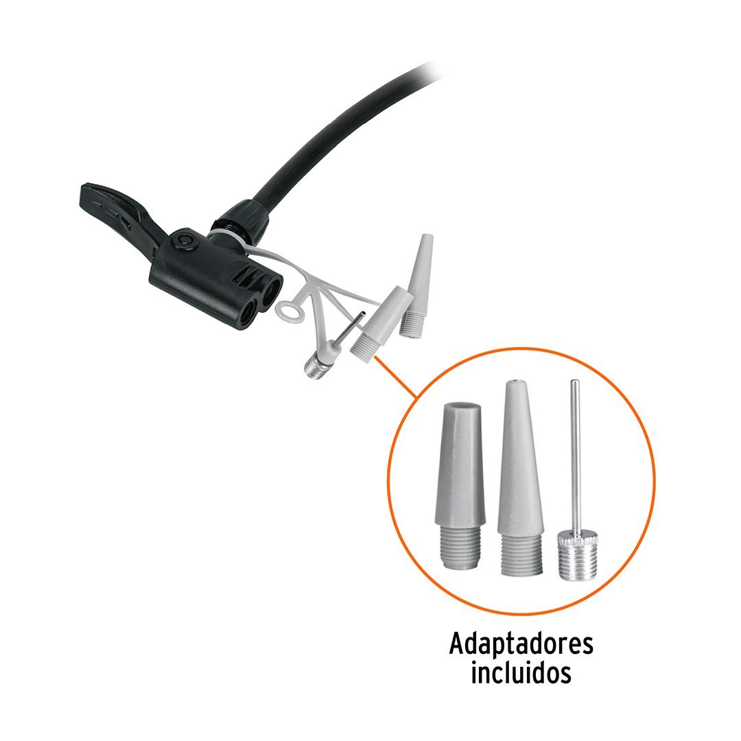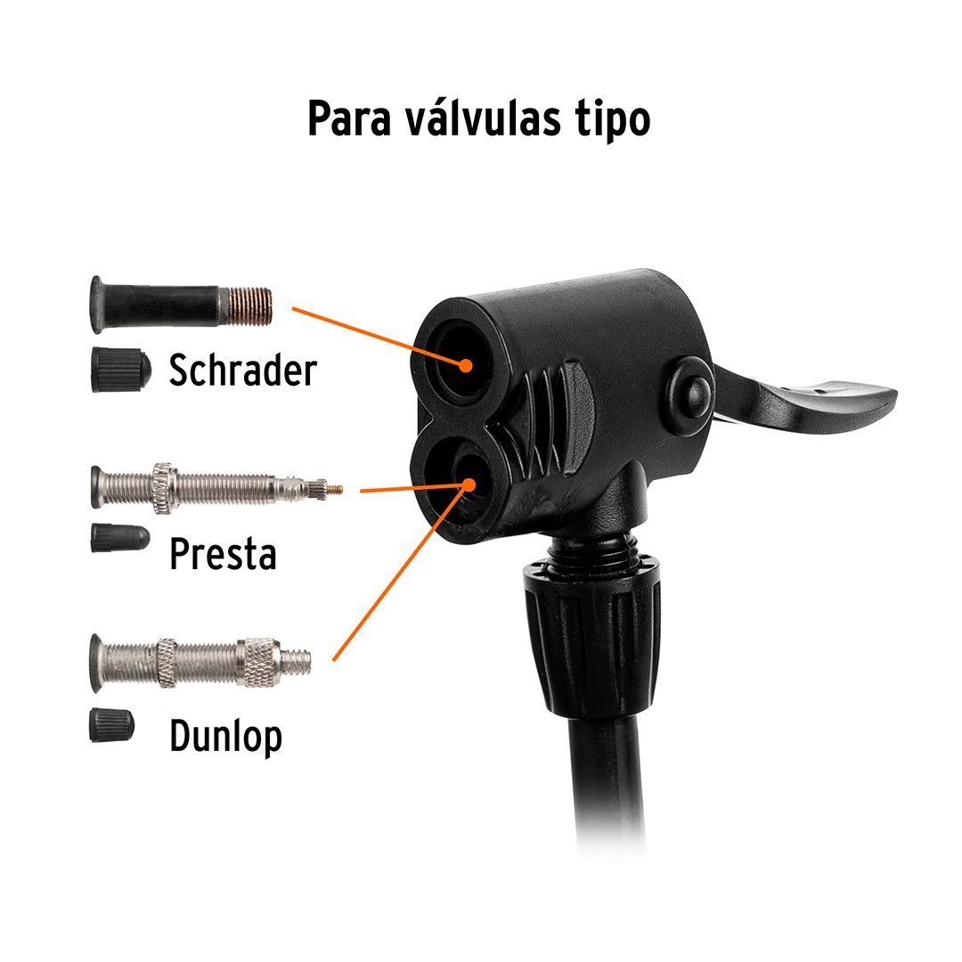 Cabeza dual que permite el uso de válvulas europea (Presta), americana (Schrader) y Dunlop. No estan incluidas.