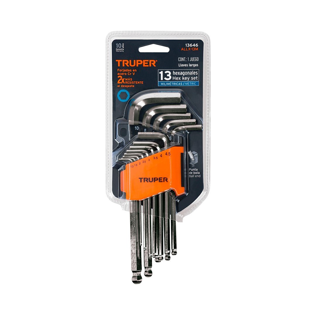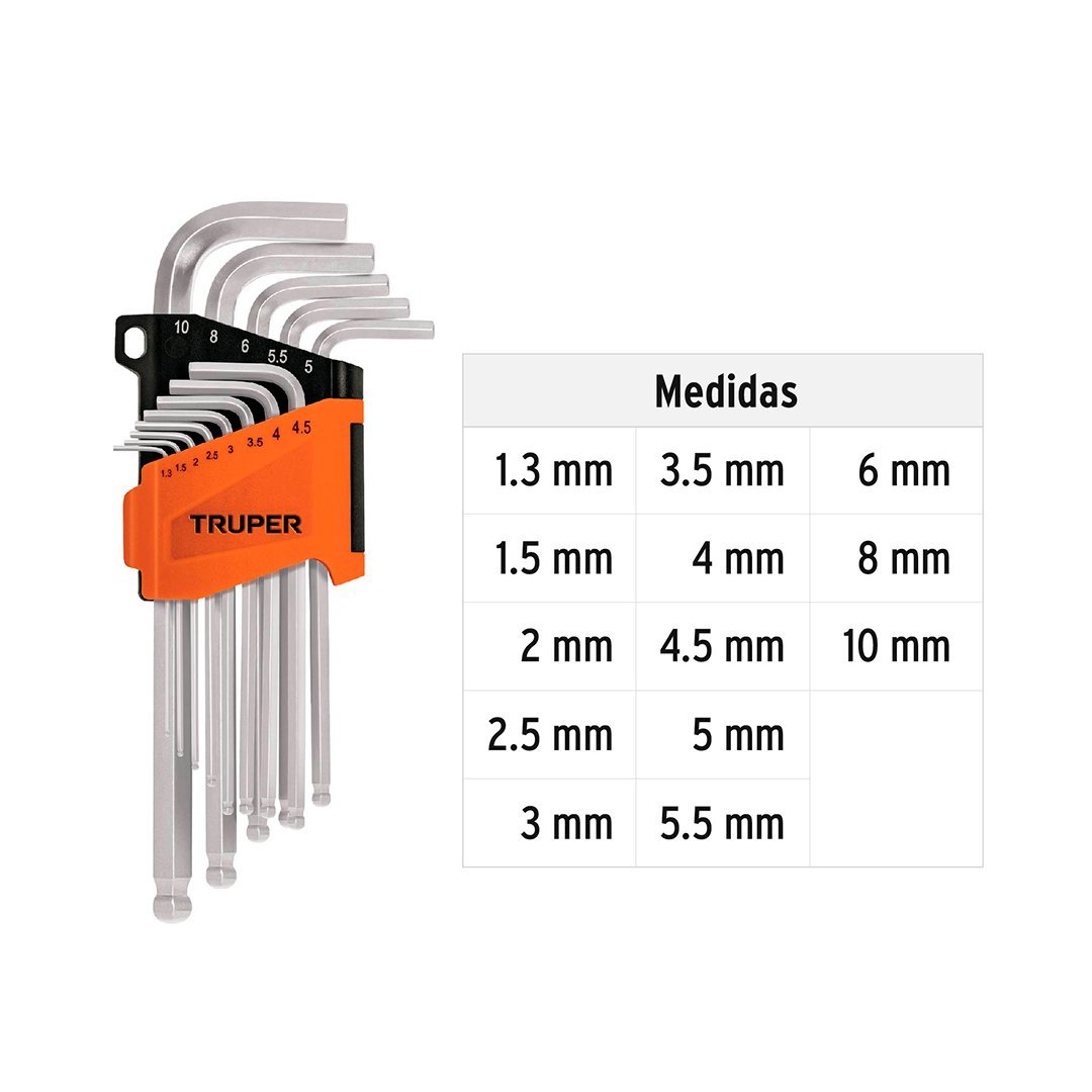 Juego 13 llaves allen largas mm punta bola con organizador TRUPER cantidad
