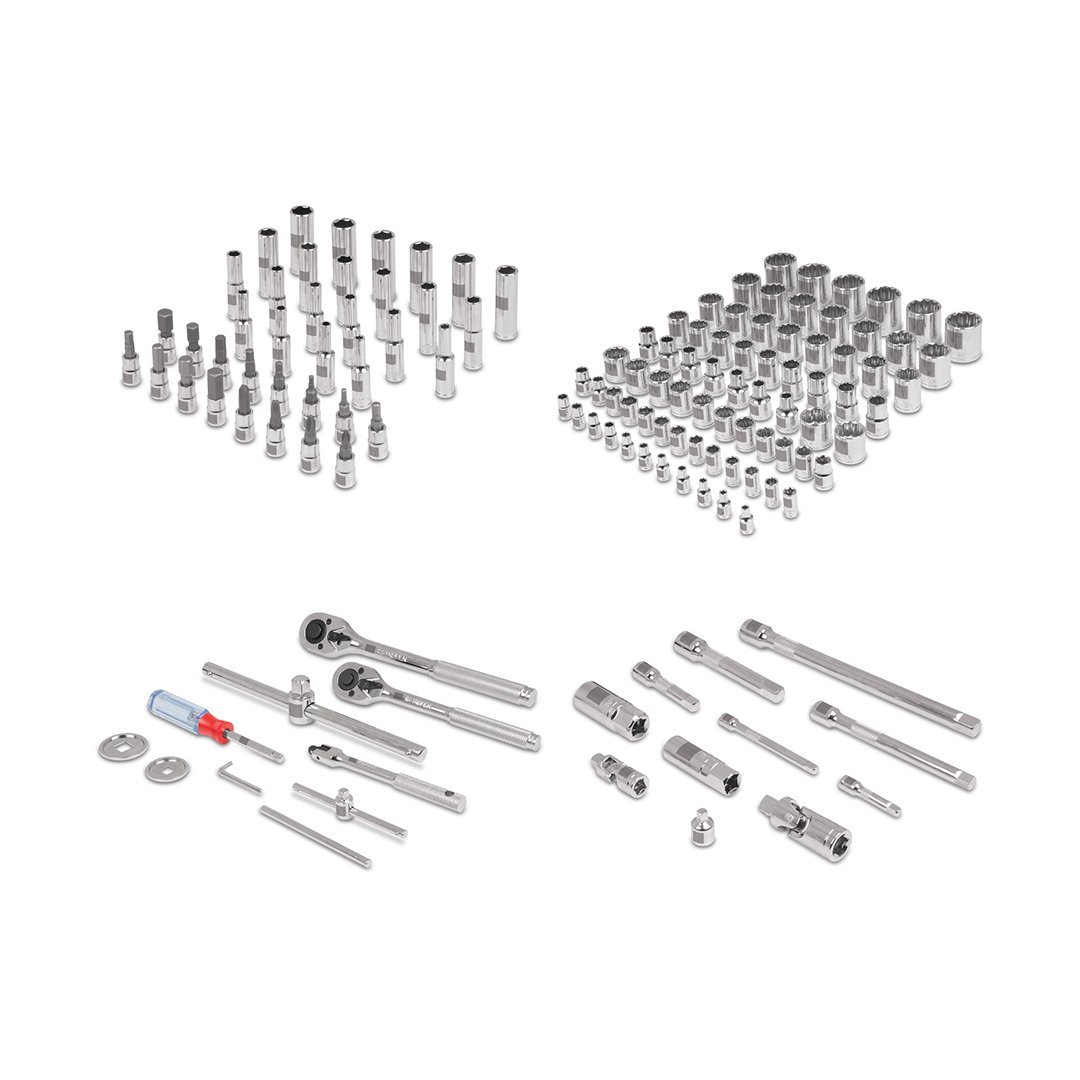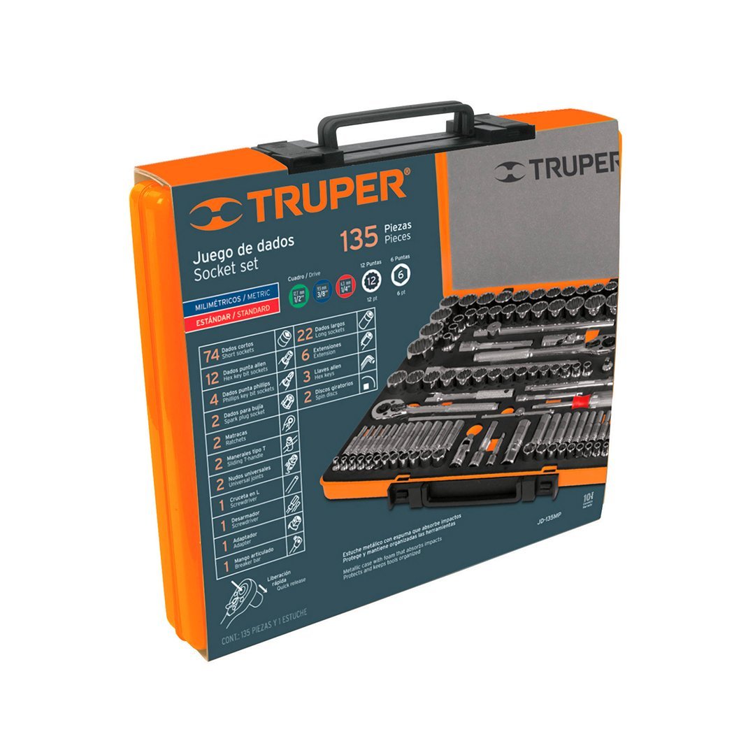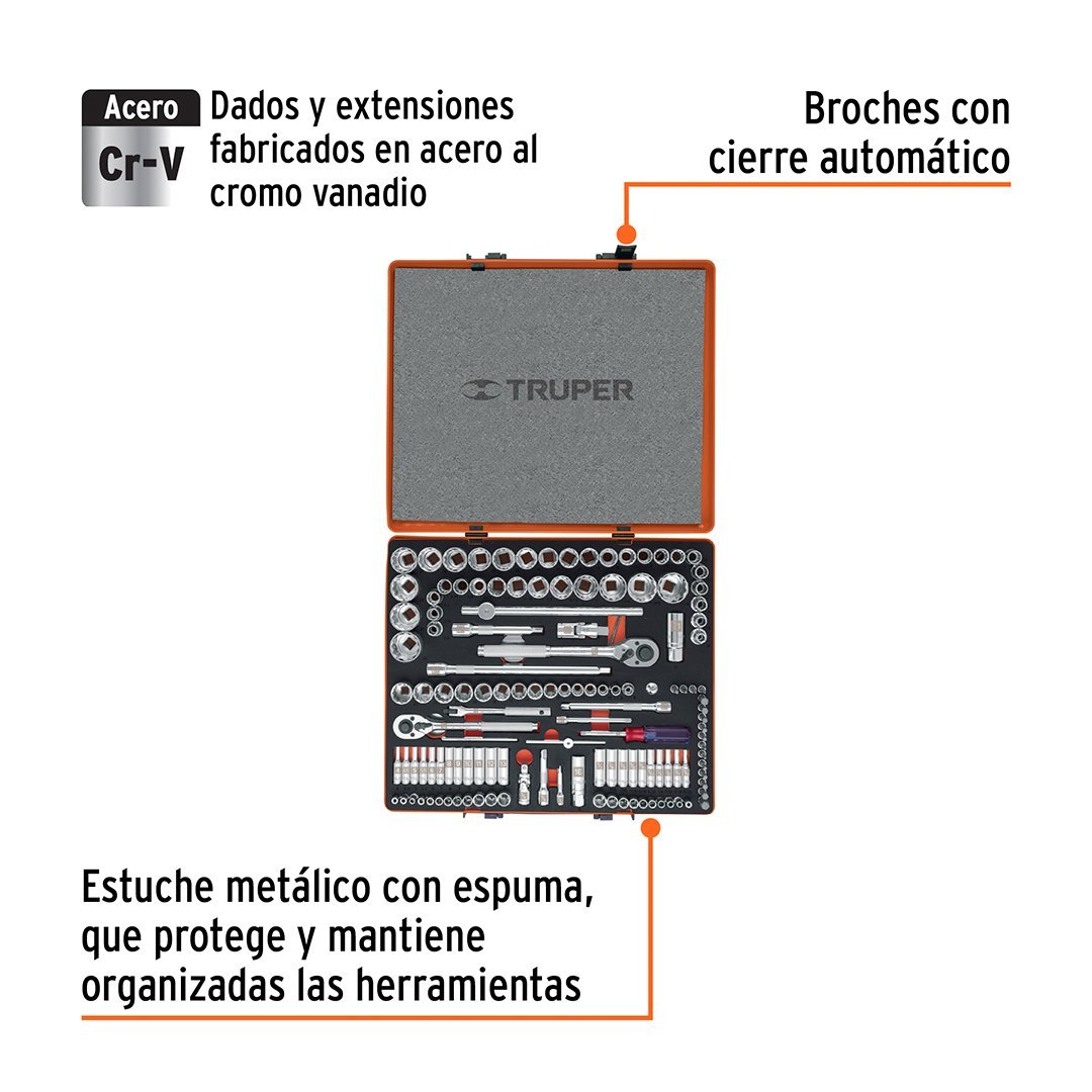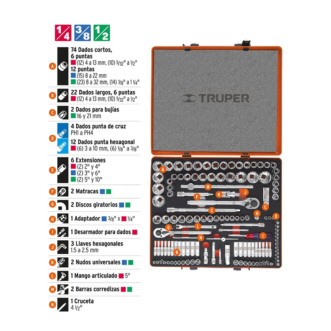 | 74 Dados cortos: (12) 4 a 13 mm, (15) 8 a 22 mm, (23) 8 a 32 mm, (10) 5/32″ a 1/2″, (14) 3/8″ a 1 1/4″ | 22 Dados largos: (12) 4 a 13 mm, (10) 5/32″ a 1/2″ |