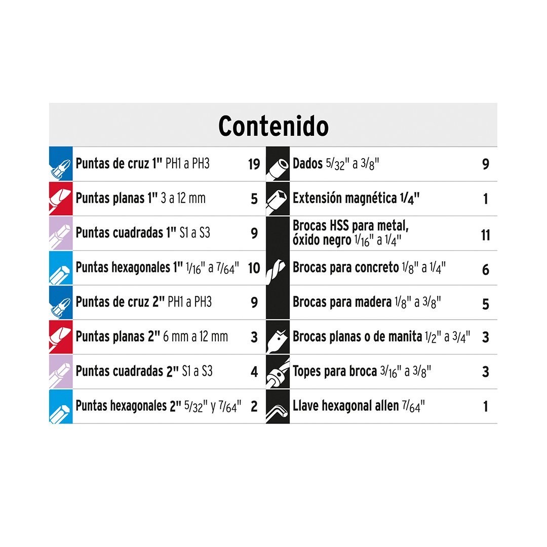 | Brocas para metal HSS, óxido negro 1/16″ a 1/4″ (11) | Broca para concreto 1/8″ a 1/4″ (6) |