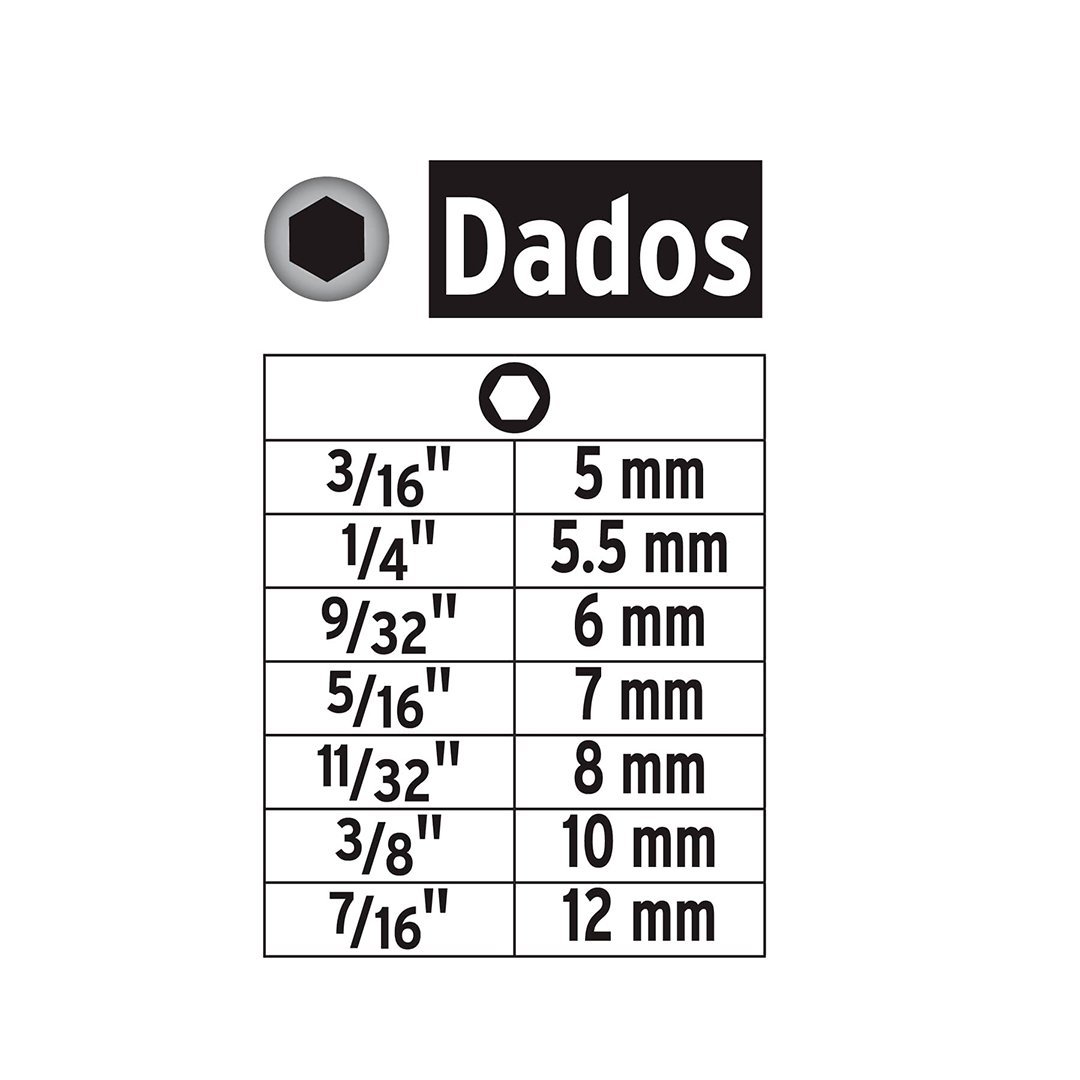 7 Dados (3/16″, 1/4″, 9/32″, 5/16″, 11/32″, 3/8″ y 7/16″)