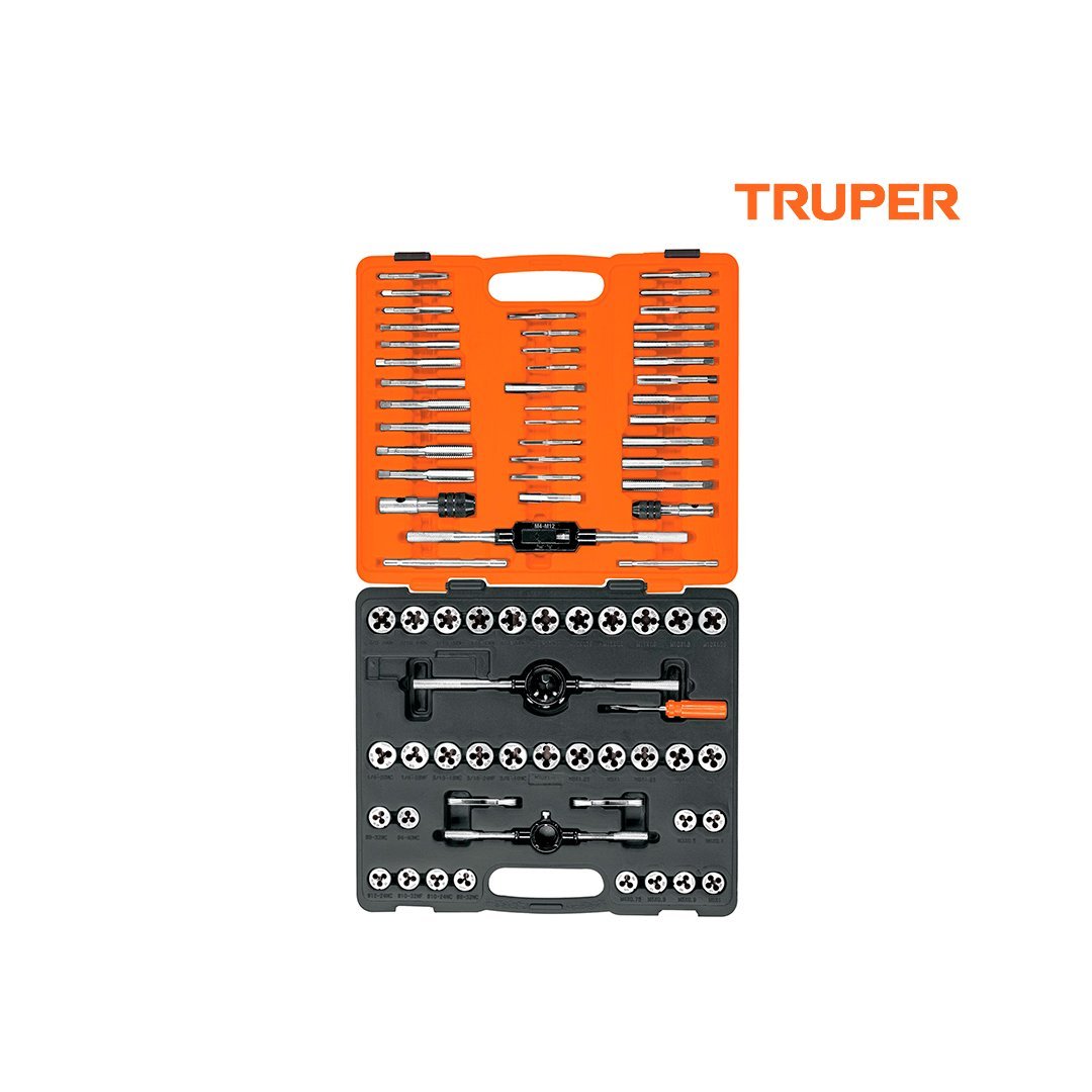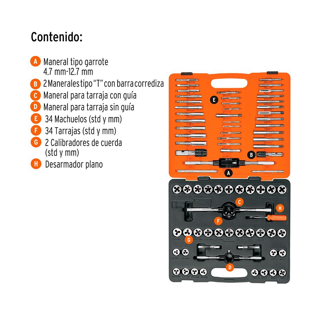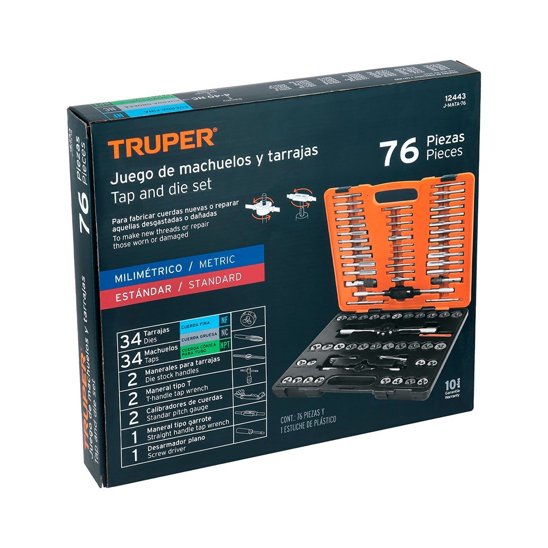| 34 Tarrajas (std y mm) Medidas: M3X0.5, M4X0.7, M4X0.75, M5X0.8, M5X0.9, M6X1, M7X1, M8X1, M8X1.25, M9X1, M9X1.25, M10X1, M10X1.25, M10X1.5, M11X1.5, M12X1.5, M12X1.75, 4-40NC, 6-32NC, 8-32NC, 10-24NC, 10-32NF, 12-24NC, 1/8X27NPT | Medidas: 1/4X20NC, 1/4X28NF, 5/16X18NC, 5/16X24NF, 3/8X16NC, 3/8X24NF, 7/16X14NC, 7/16X20NF, 1/2X13NC, 1/2X20NF |