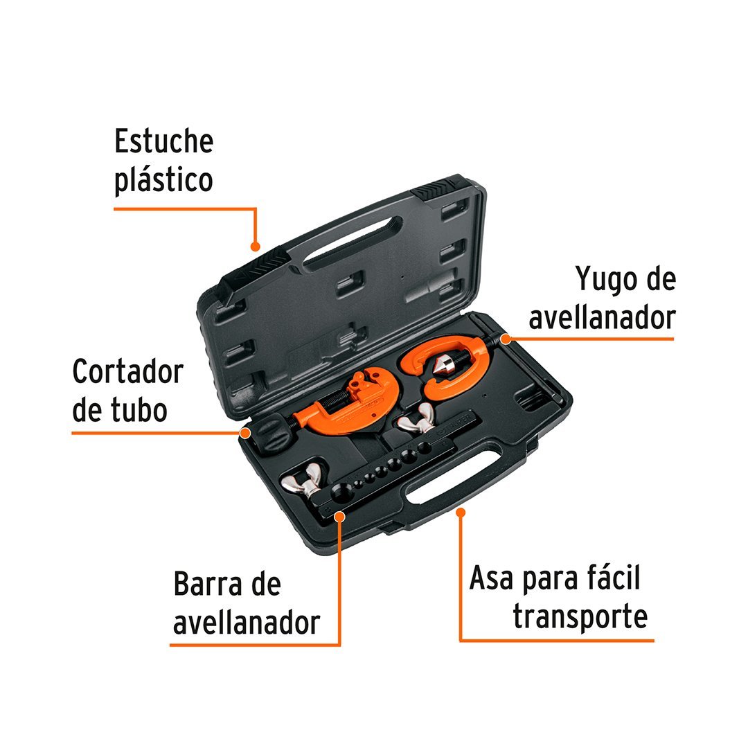Capacidad del avellanador Tubos de 3/16″, 1/4″, 5/16″, 3/8″, 7/16″, 1/2″ y 5/8″