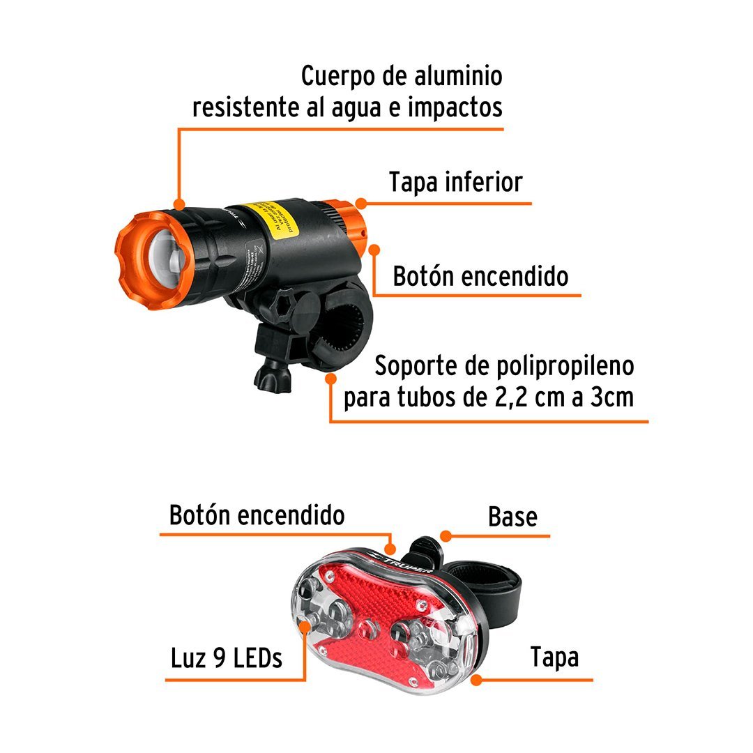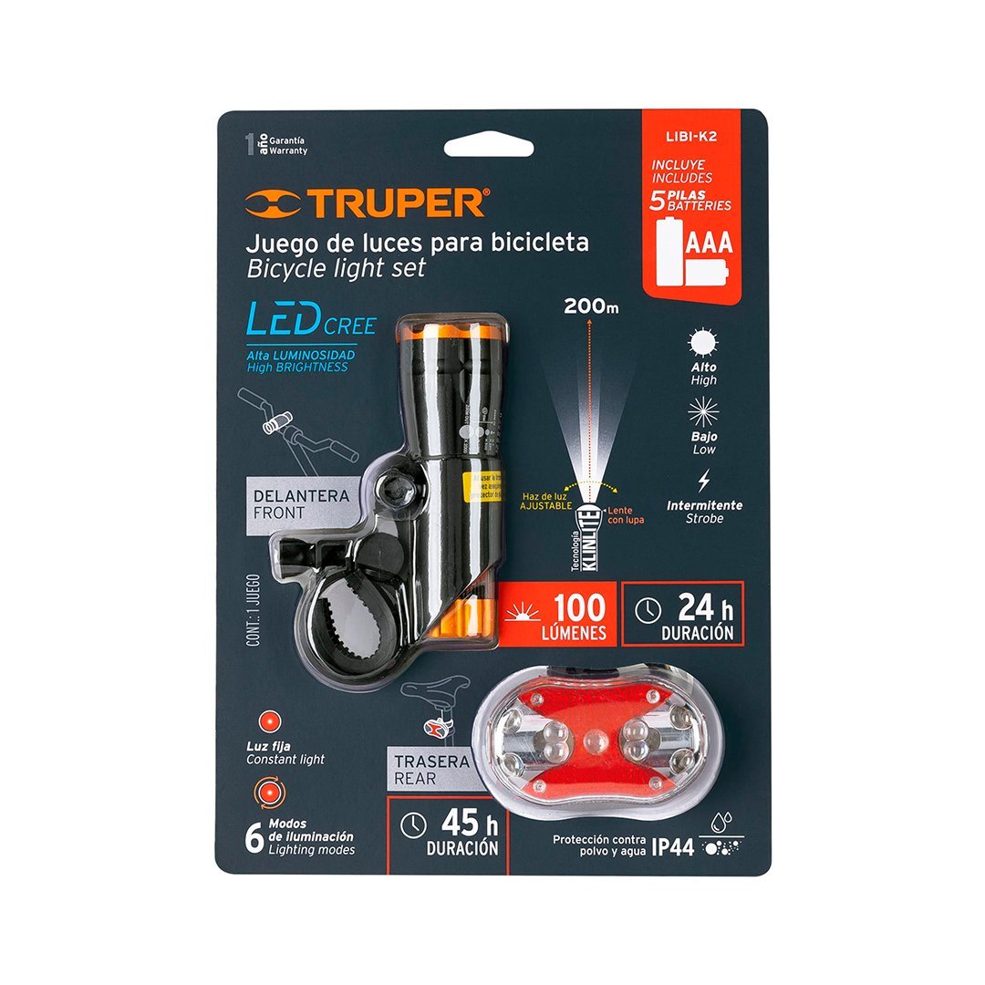 Alto, bajo e intermitente (delantera) Luz roja fija y 6 diferentes destellos de luz (trasera) |