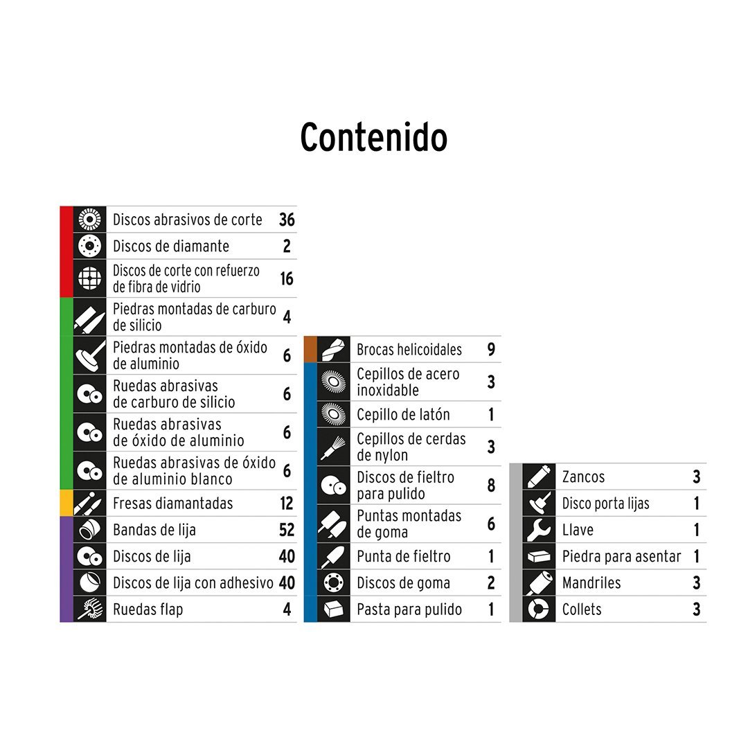 | 16 Discos de corte con refuerzo de fibra de vidrio | 4 Puntas montadas de carburo de silicio |