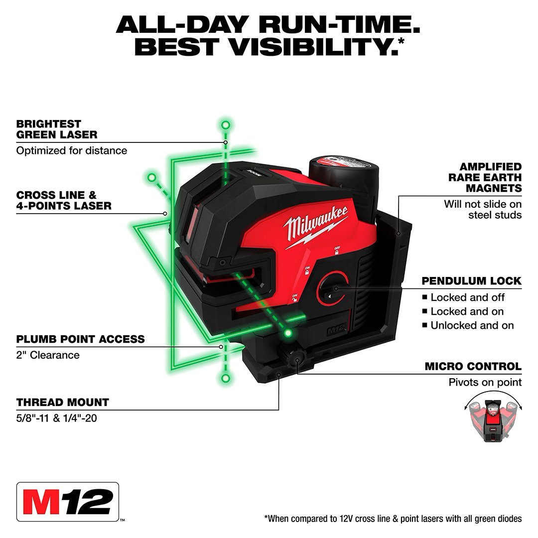 • El láser verde de línea cruzada y 4 puntos M12™ ofrece un tiempo de operación durante todo el día y la mejor visibilidad en su clase.