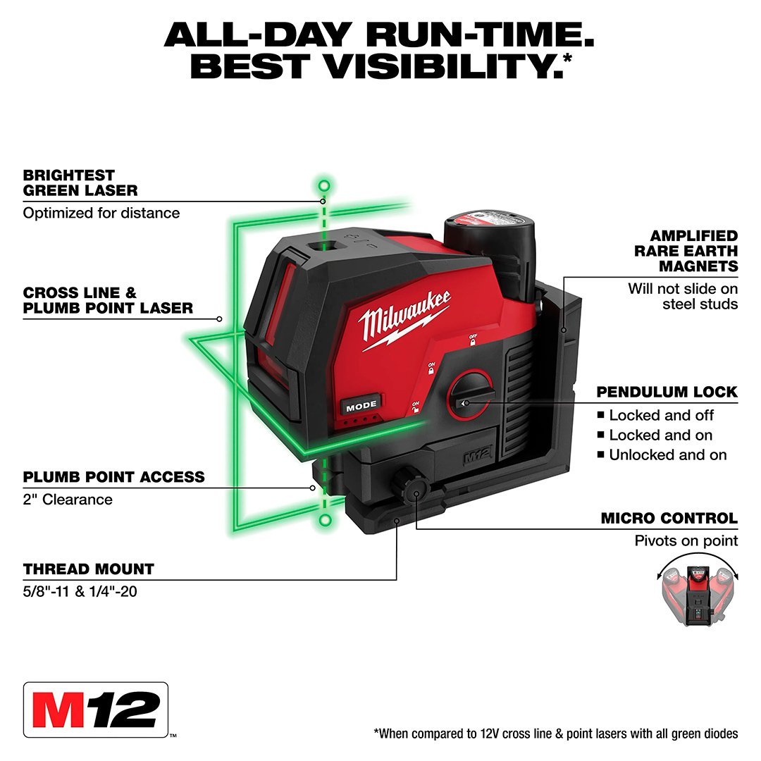 El láser verde de puntos de plomada y línea transversal M12™ proporciona operación durante todo el día y la mejor visibilidad en su clase. Con la batería M12™ REDLITHIUM™ 3.0 CP, obtiene más de 15 horas de operación continua para obtener la máxima productividad.