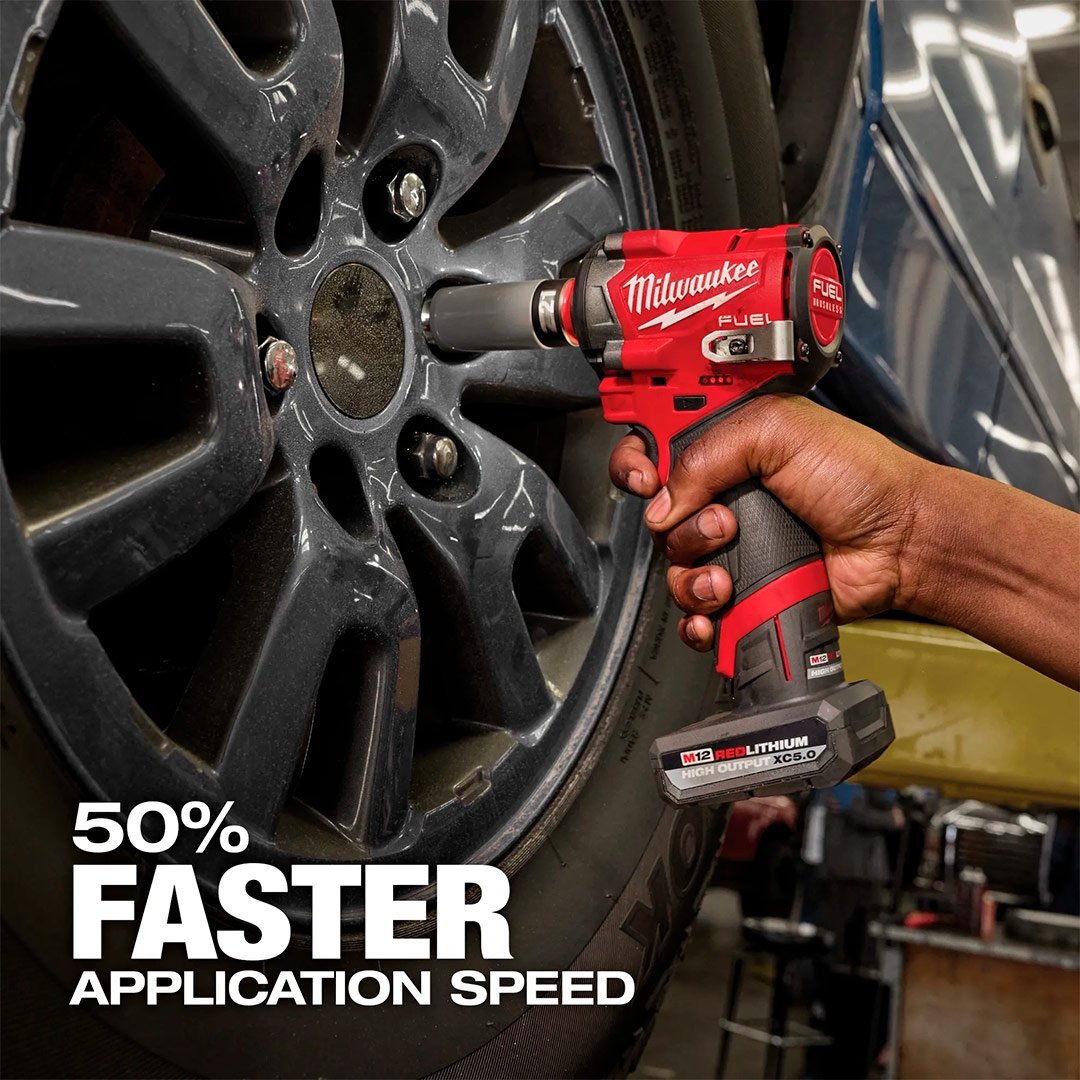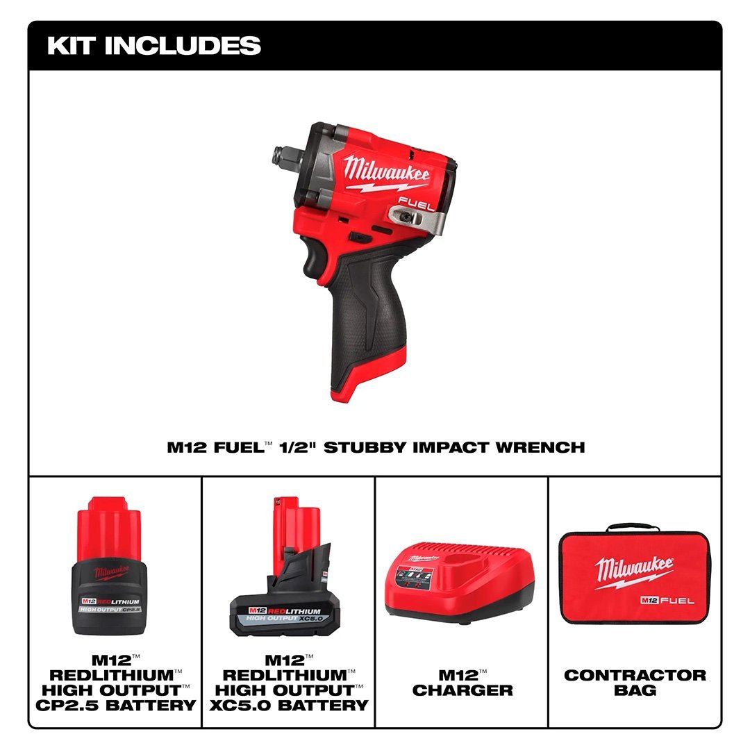 • Compacta y potente: la llave de impacto M12 FUEL Stubby de 1/2″ ofrece hasta 250 ft-lbs de torque que rompe las tuercas en un diseño ligero y ultracompacto.