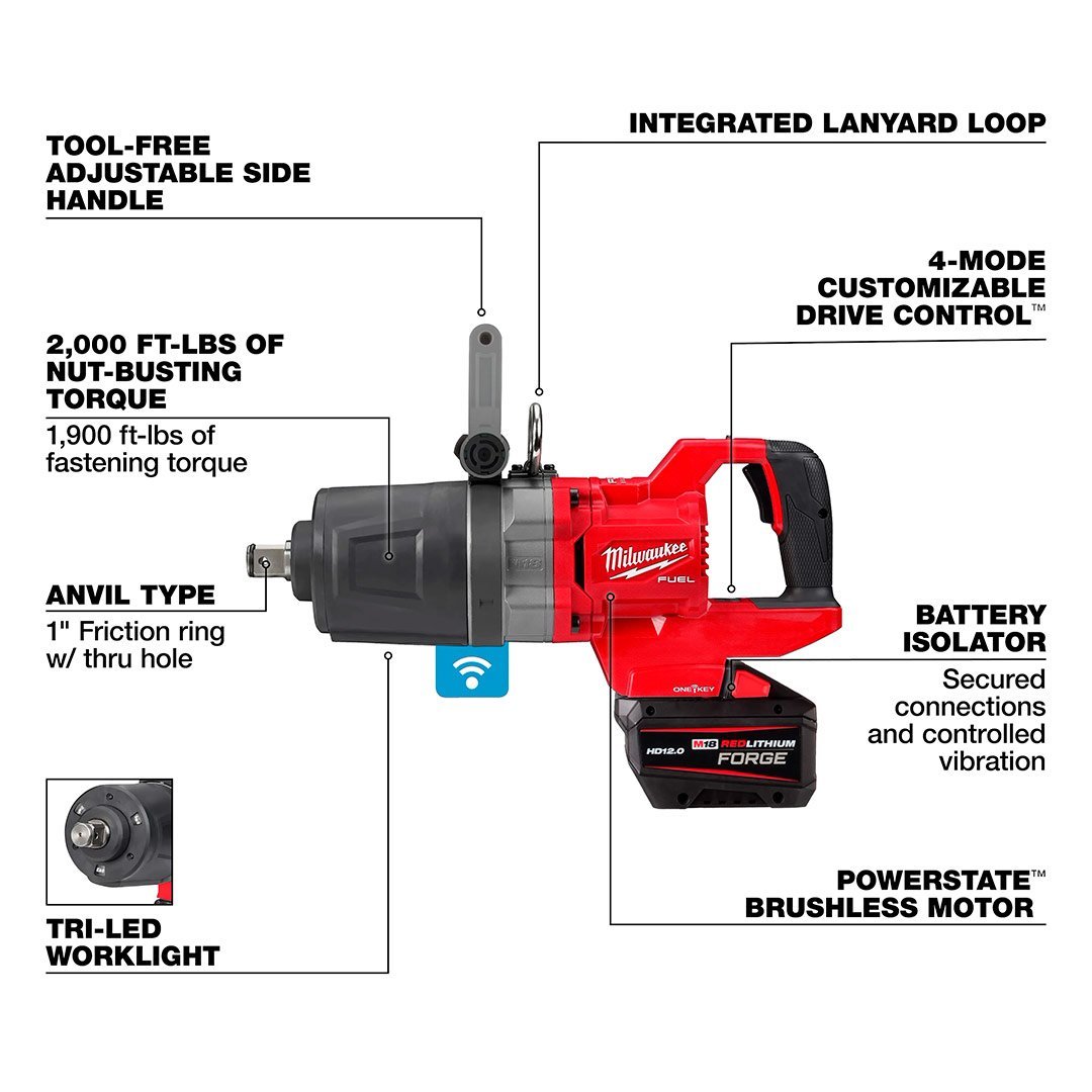 La llave cuenta con la primera llave de impacto de alto torque inalámbrica con mango en D de 1″ en el mundo. El motor sin escobillas POWERSTATE ofrece hasta 2,000 pies-lb de torque de arranque y 1,900 pies-lb de torque de fijación, lo que la convierte en la llave de impacto inalámbrica más potente y le permite realizar las aplicaciones más exigentes.
