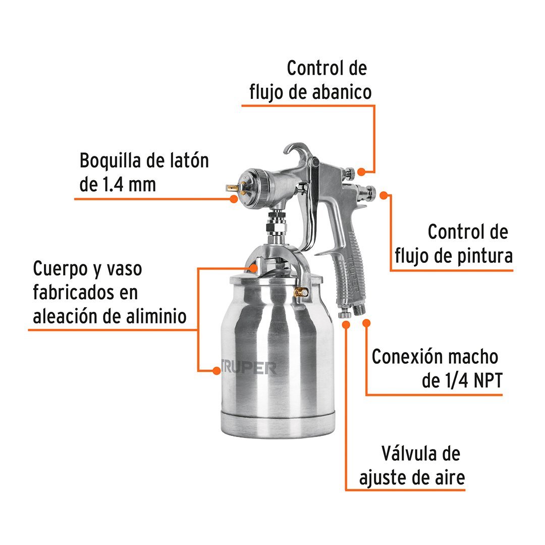 Pistola de aire para pintar de succión HVLP vaso aluminio, 1.4 mm TRUPER