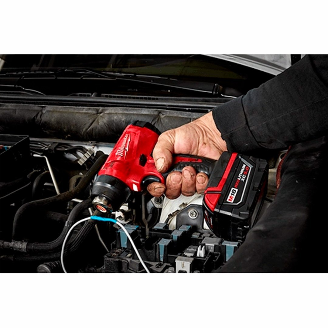 Calienta las conexiones rápidamente. En cualquier lugar y en cualquier momento. Se calienta un 30 % más rápido que las pistolas alámbricas. Más compacta y se puede colgar o poner de pie. Una carga, más de 40 conexiones. La pistola de aire caliente compacta M18™ realiza aplicaciones de forma rápida, ya que alcanza la temperatura de operación en menos de 7 segundos. Debido a que es la pistola de aire caliente eléctrica más compacta entre los líderes del mercado, puede usarse en lugares a los que no se puede acceder con las pistolas de aire caliente alámbricas. La boquilla con protección proporciona mayor protección para las superficies de trabajo y el gancho para escaleras permite a los usuarios colgar la herramienta fácilmente entre aplicaciones. Gracias a que utiliza la tecnología de baterías REDLITHIUM™ es capaz de calentar más de 40 conexiones con una sola batería XC5.0 en cualquier lugar y en cualquier momento sin los inconvenientes de los cables. La pistola de aire caliente compacta M18™ cuenta con la inteligencia REDLINK PLUS™ con un sistema de administración de la temperatura para proporcionar una máxima vida útil.