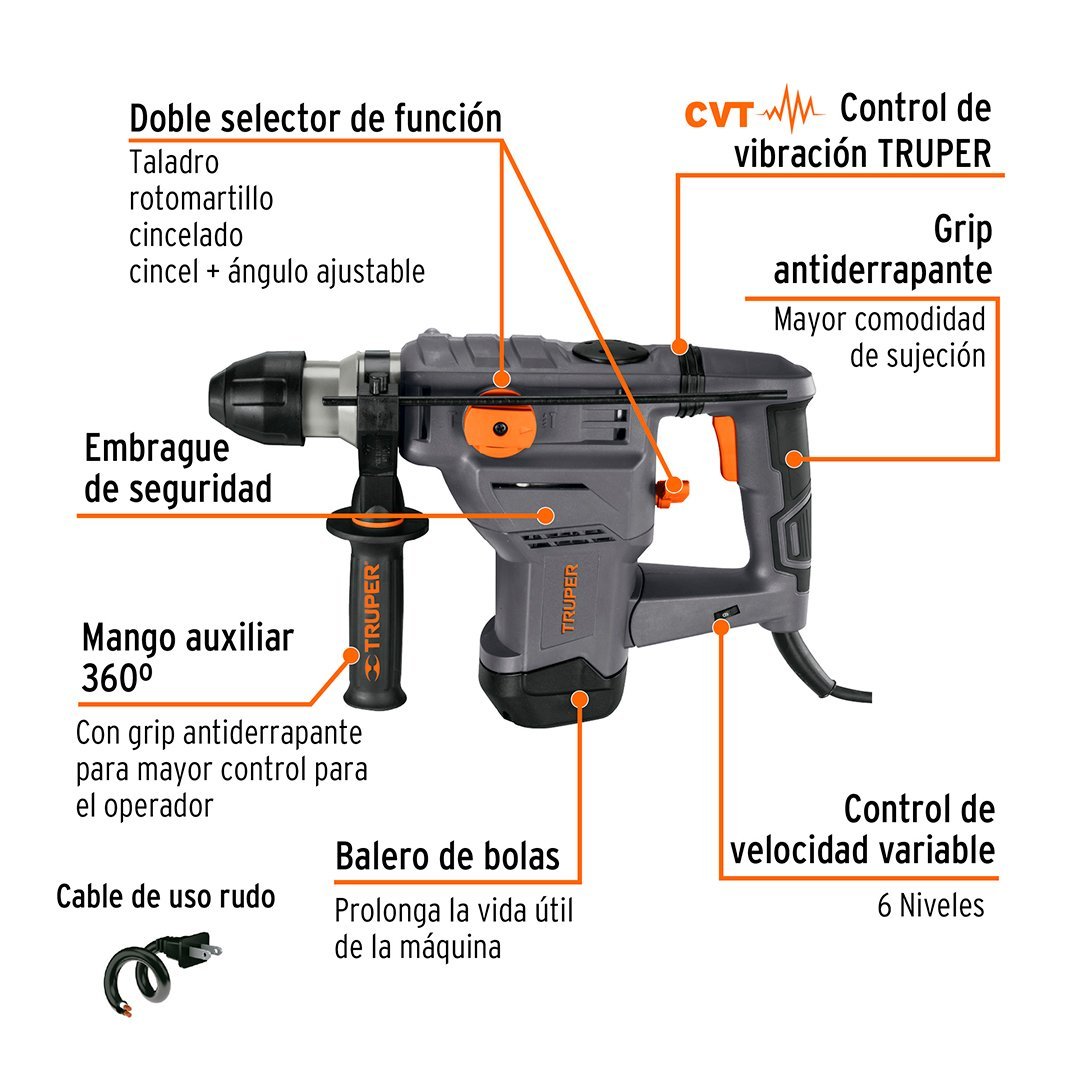 • Mango con sistema de Control de Vibración Truper (CVT) que reduce las vibraciones, haciendo el trabajo más confortable y seguro para el operador