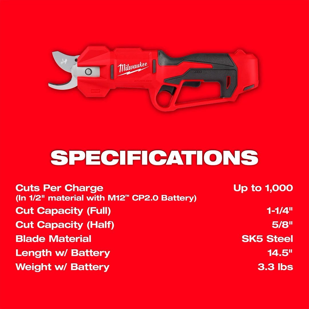 Las tijeras de podar sin escobillas M12™ ofrecen la poda más rápida y controlada, a la vez que reducen la fatiga. Estas tijeras ofrecen la potencia para cortar ramas de hasta 3,18 cm (1-1/4″) y permiten bloquear las cuchillas a la mitad de su capacidad mediante el panel de selección de modo, lo que aumenta la velocidad de corte en un 40 %. Las tijeras de podar sin escobillas M12™ reducen el esfuerzo muscular en un 75 % en comparación con las soluciones manuales, lo que permite a los usuarios realizar cortes difíciles con facilidad y rapidez. Nuestro control activo de cuchillas permite que el movimiento de la cuchilla siga el movimiento del gatillo, lo que proporciona un mayor control sobre la capacidad de corte durante la poda. Esto, combinado con la selección de modo y su diseño ligero y en línea, ofrece mayor accesibilidad y control en podas complejas. Al combinarse con la batería M12™ CP2.0, estas tijeras de podar realizan hasta 1000 cortes por carga en ramas de 1,27 cm (½»). Nuestras tijeras de podar sin escobillas M12™ son totalmente compatibles con más de 150 soluciones dentro del sistema M12™.